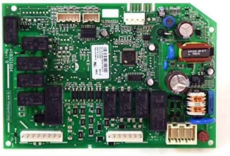 Electronic control board W11035841 manages the functions of the refrigerator such as cooling and defrost times.